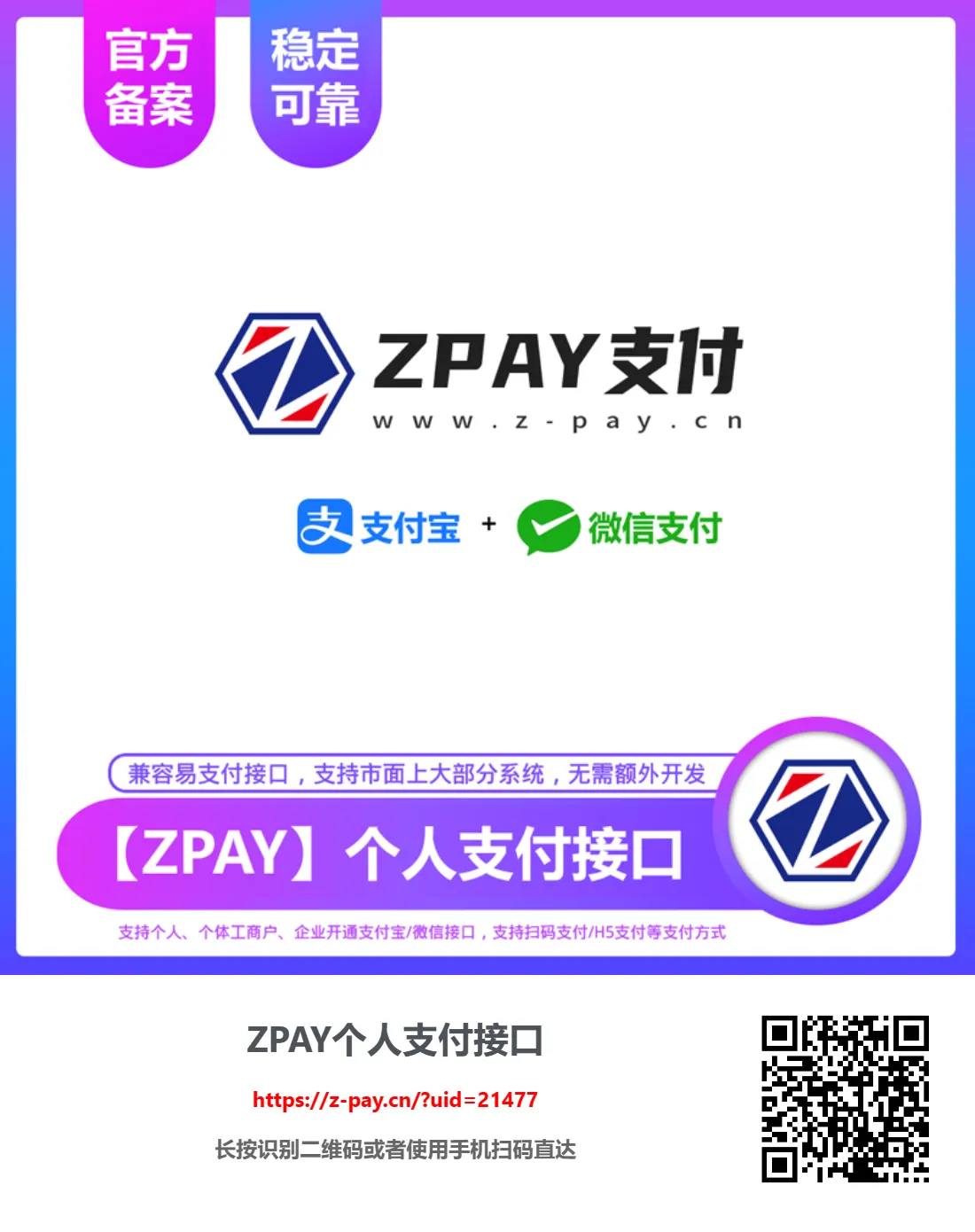 「ZPAY支付」作为微信支付服务商和支付宝ISV服务商,专业为开发者/个体户/小微企业提供正规、安全、稳定的创收支持;点击链接直达:https://z-pay.cn/?uid=21477